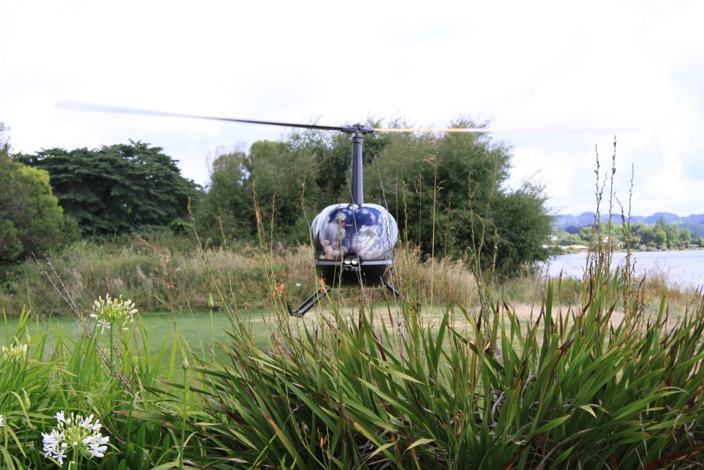 Rond 10:00 uur horen we de heli al en op dat moment was het al weer lekker zonnig buiten. De heli land voor het huis van de buren en nadat we een safety-vest en koptelefoon hebben gekregen, stappen we in. Het opstijgen gaat heel kalm en het is een apart gevoel als je los van de aarde bent.