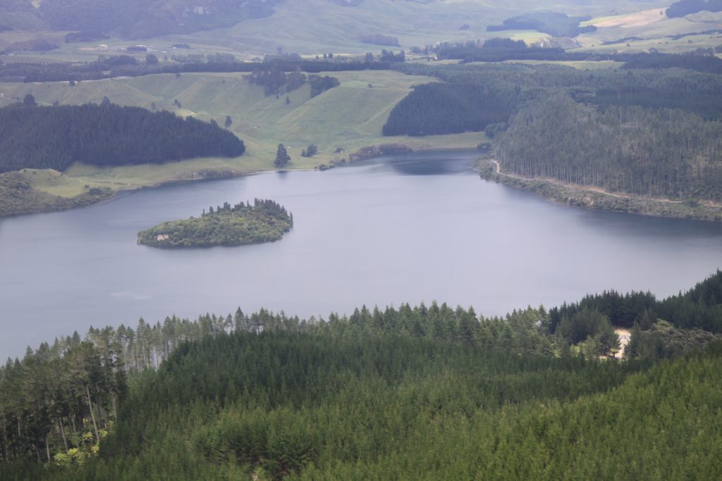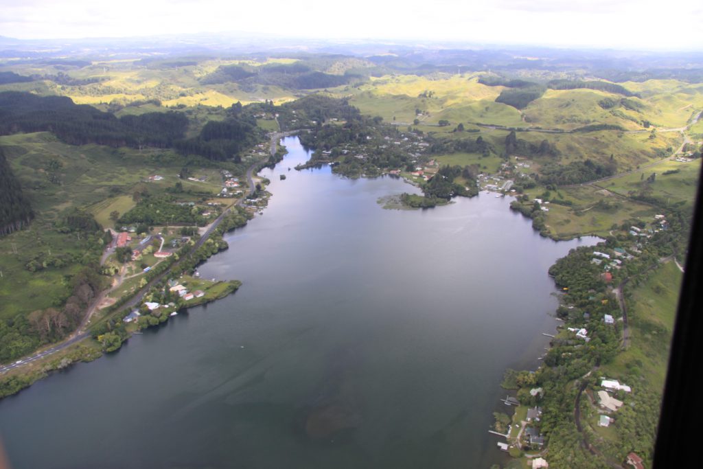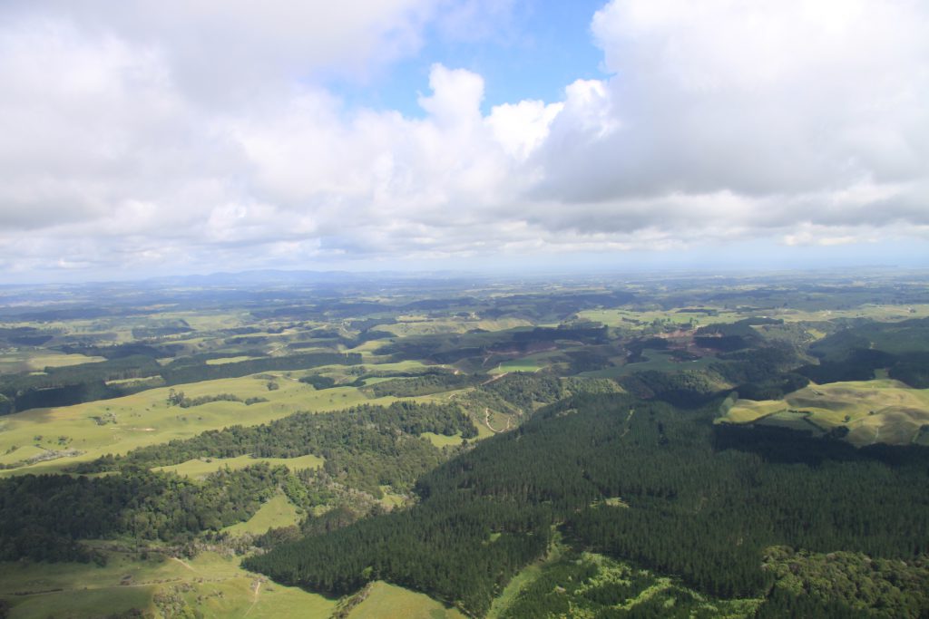 We vliegen eerst over Lake Rotorua en daarna over een stuk land naar de zee. We zien onder ons Kiwiplantages en veel koeien en schapen lopen.