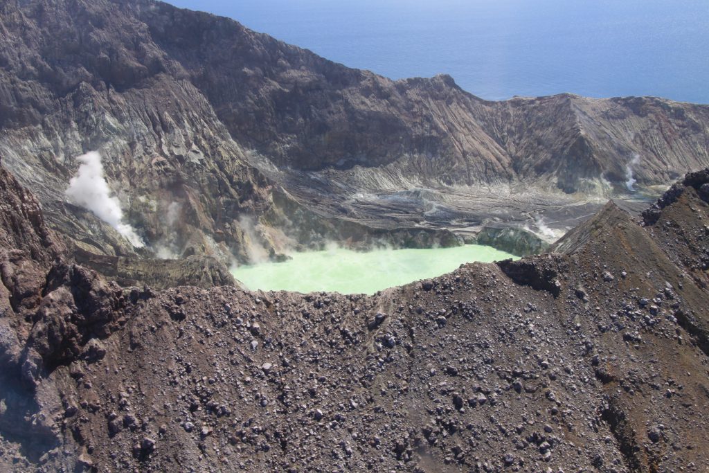 Na een vlucht van 50 km. over water komen we bij White Island. Als we geland zijn krijgen we een gasmasker voor het geval dat we door giftige dampen komen te lopen.