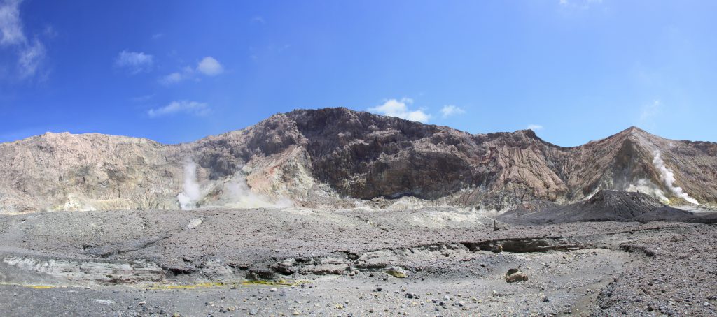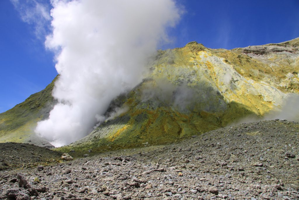 Op White Island voelen we af en toe een prikkelend gevoel op ons gezicht en armen.Dat schijnt de “Acid Rain” te zijn, zwavelhoudend water dat door de wind wordt weggeblazen.