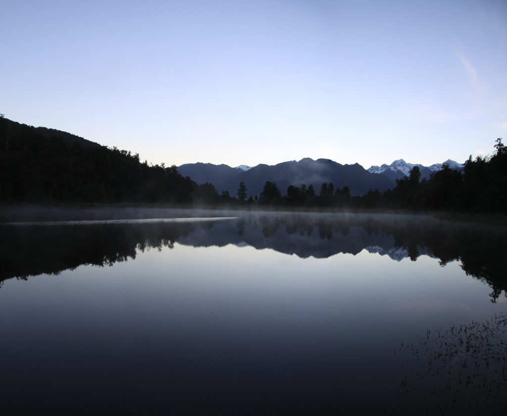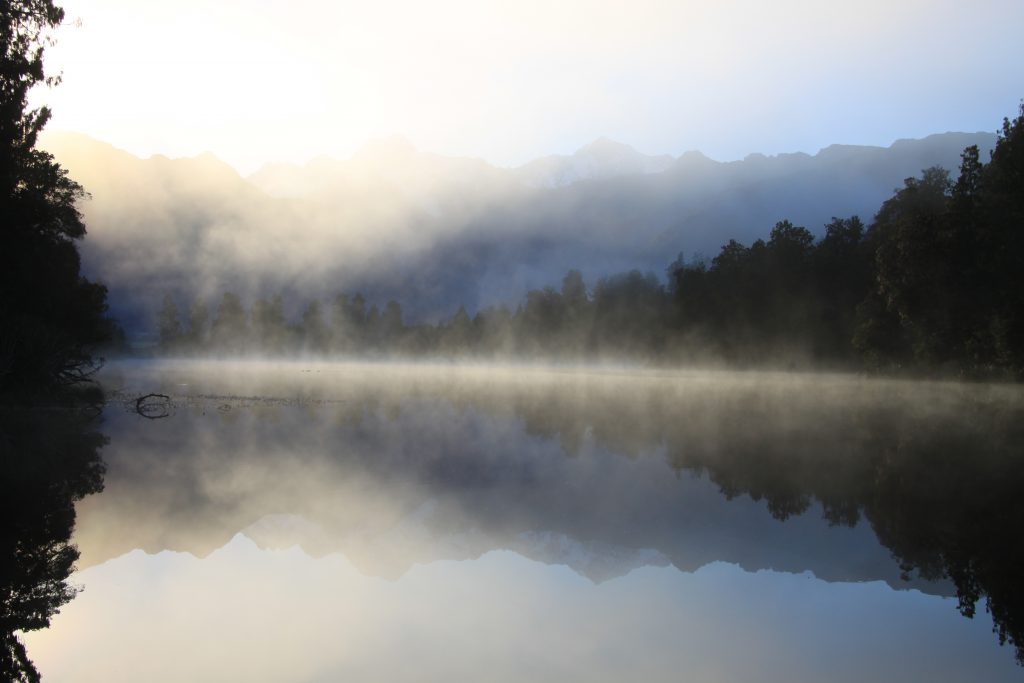 Vanmorgen vroeg (05:30 uur) opgestaan en rond 06:00 uur waren we bij lake Matheson.Het meer was bijna glad, slechts enkele rimpeltjes, maar het was heel helder. We zijn verder gelopen naar Lake Viewpoint. Daar zaten al wat mensen en er steeg al wat damp op van het oppervlak van het meer.