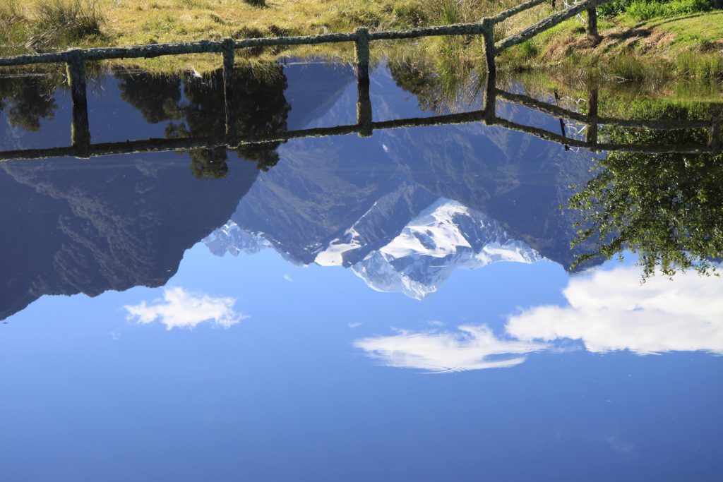 Na het ontbijt werden we gewezen op de mogelijkheid, de beide bergen weerspiegeld te zien in de vijver naast het huis. Dat leverde enkele verassend mooie beelden op. Voordat we de grote weg opgingen eerst nog even getankt, omdat de volgende mogelijkheid om te tanken meer dan 100km. verderop was.