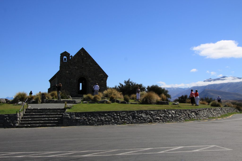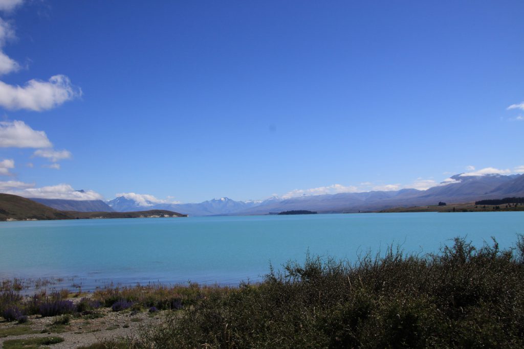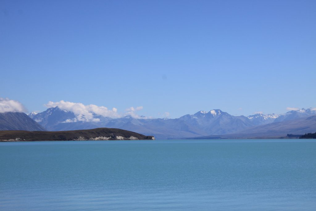 Toen we richting Lake Tekapo waren zagen we dat de bewolking optrok en toen we bij “The church of the good sheperd” waren, zagen we de bergtoppen redelijk goed en duidelijk.