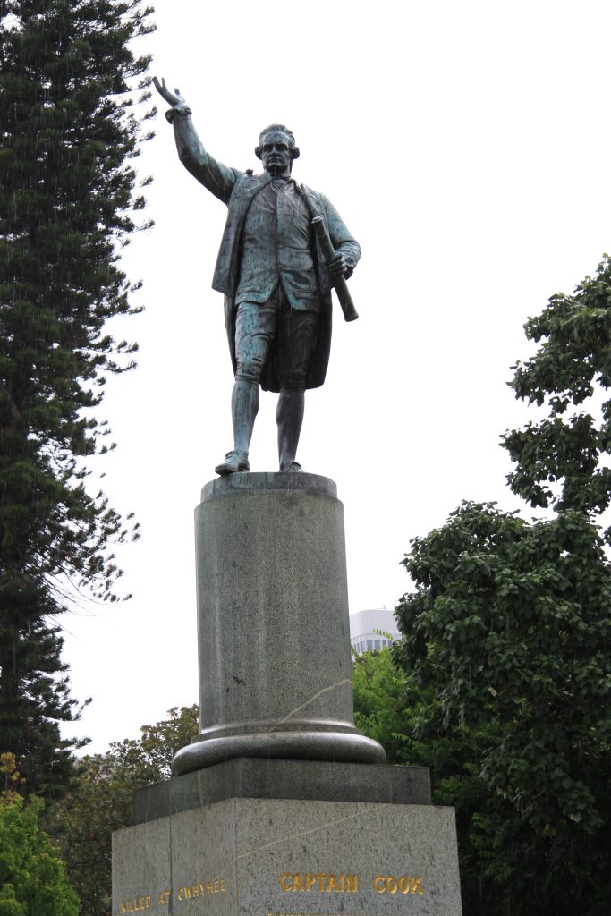 Toen we in Hyde Park liepen om een foto van het standbeeld van James Cook te maken, begon het flink te regenen.