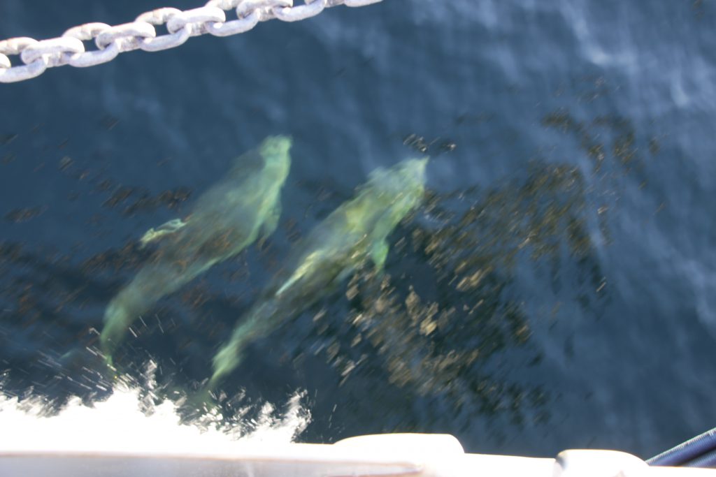 Vanochtend voor het ontbijt, de oproep dat er dolfijnen gezien waren. Er zwommen er een aantal met de boot mee.