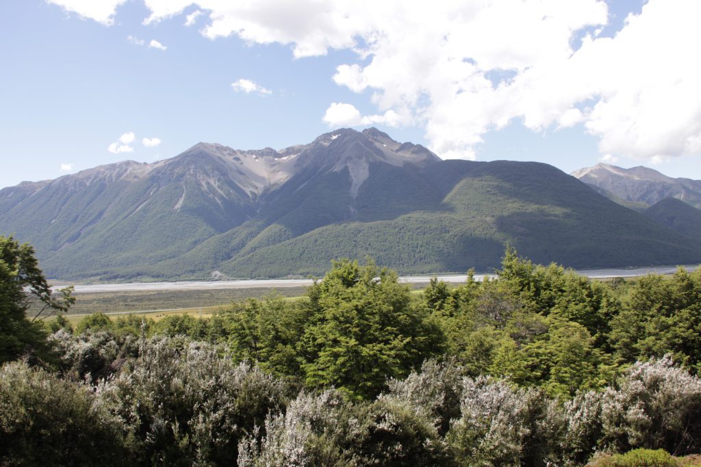 Het is geen lange rit naar Arthur’s pass. Onderweg is het zonnig en de weg is erg vlak. Als het dan wat steiler wordt, genieten we van de vergezichten.