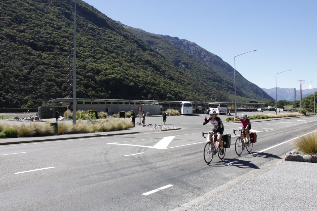 Na het ontbijt gaan we naar Arthur’s Pass village. Onderweg zien we Sarah en James al fietsen en bij Arthur’s Pass maken we foto’s van hen als ze langskomen fietsen. We zullen ze naar hen mailen en zwaaien hen gedag.