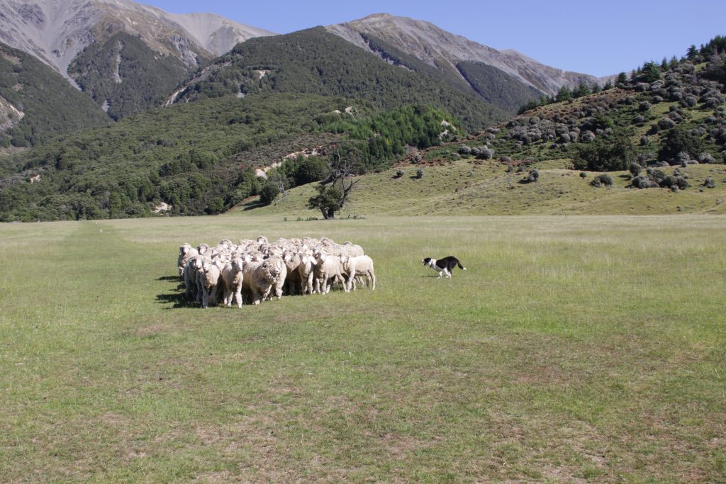 De bordercollies zijn heel goed afgericht om de schapen bijeen te drijven. De farmer heeft meerdere honden en is bezig de jonge honden af te richten. Komisch was een jonge hond die zich wist los te rukken en toen achter de schapen aanging, de schapen natuurlijk alle kanten op totdat ze hem weer te pakken hadden.
