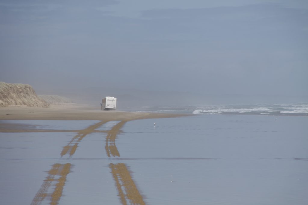 De rit over het strand is erg apart, we reden met 3 bussen ong. 100 Km per uur over het harde strand.